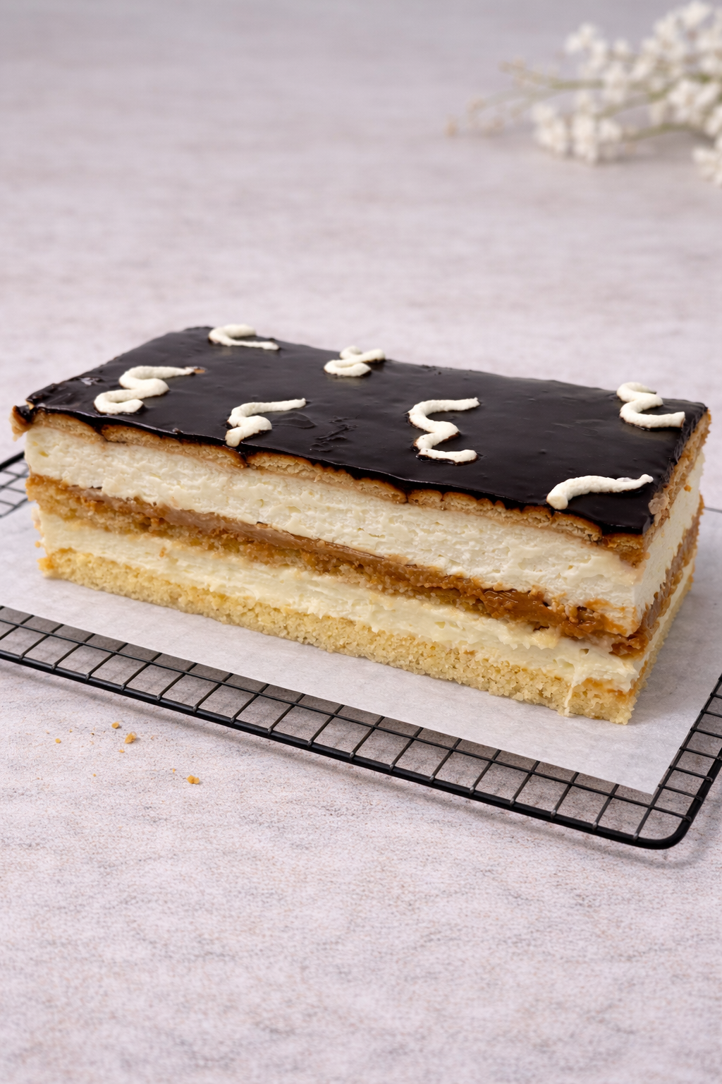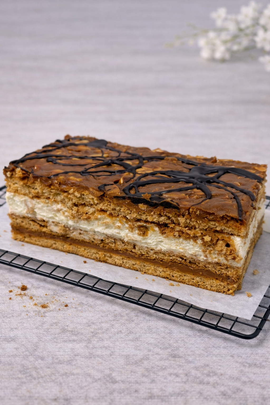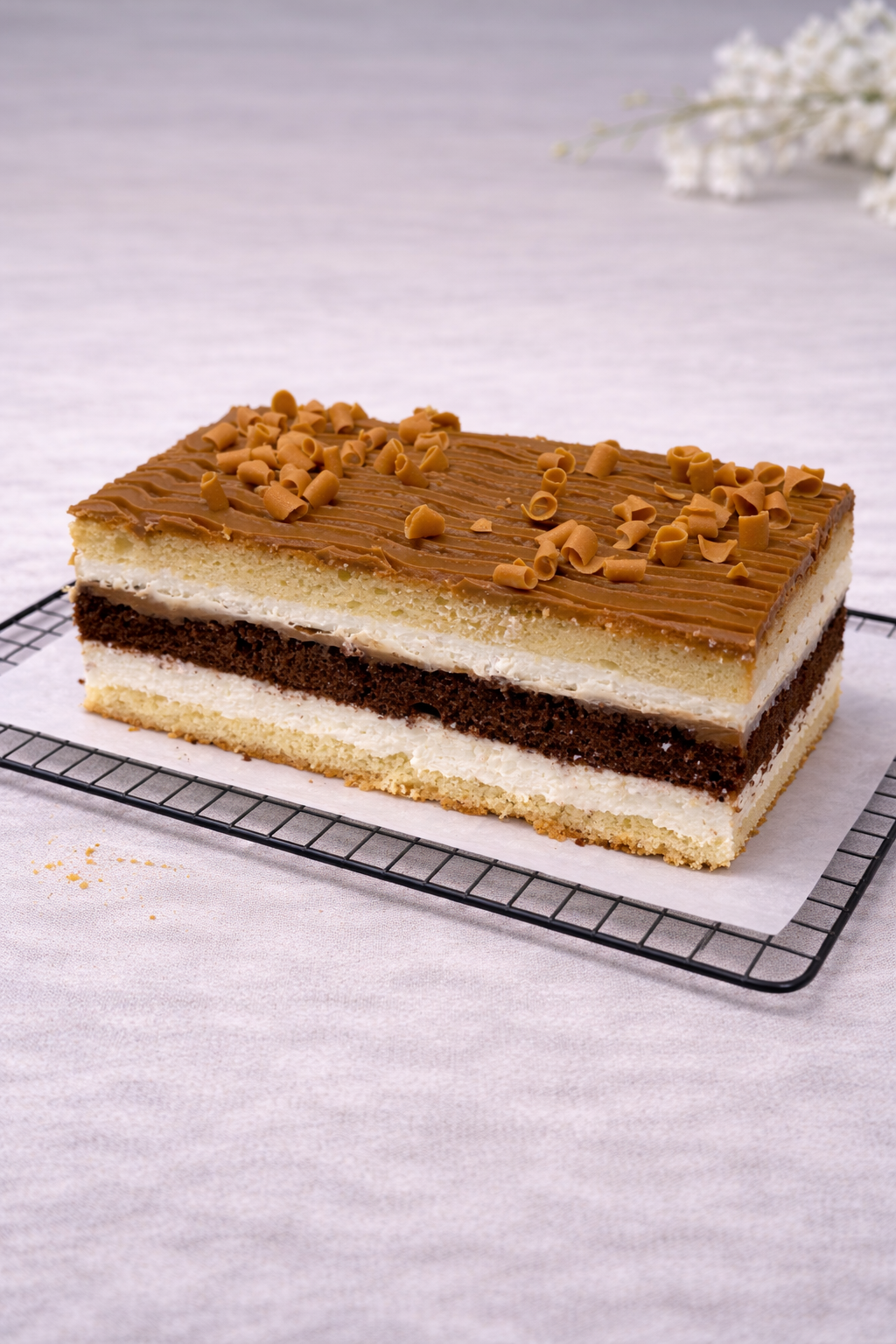 Ciasto złożone z trzech warstw chrupiących herbatników, przełożonych aksamitną masą kajmakową, delikatnym kremem budyniowym oraz lekką masą śmietanową. Całość zwieńczona polewą z czekolady.