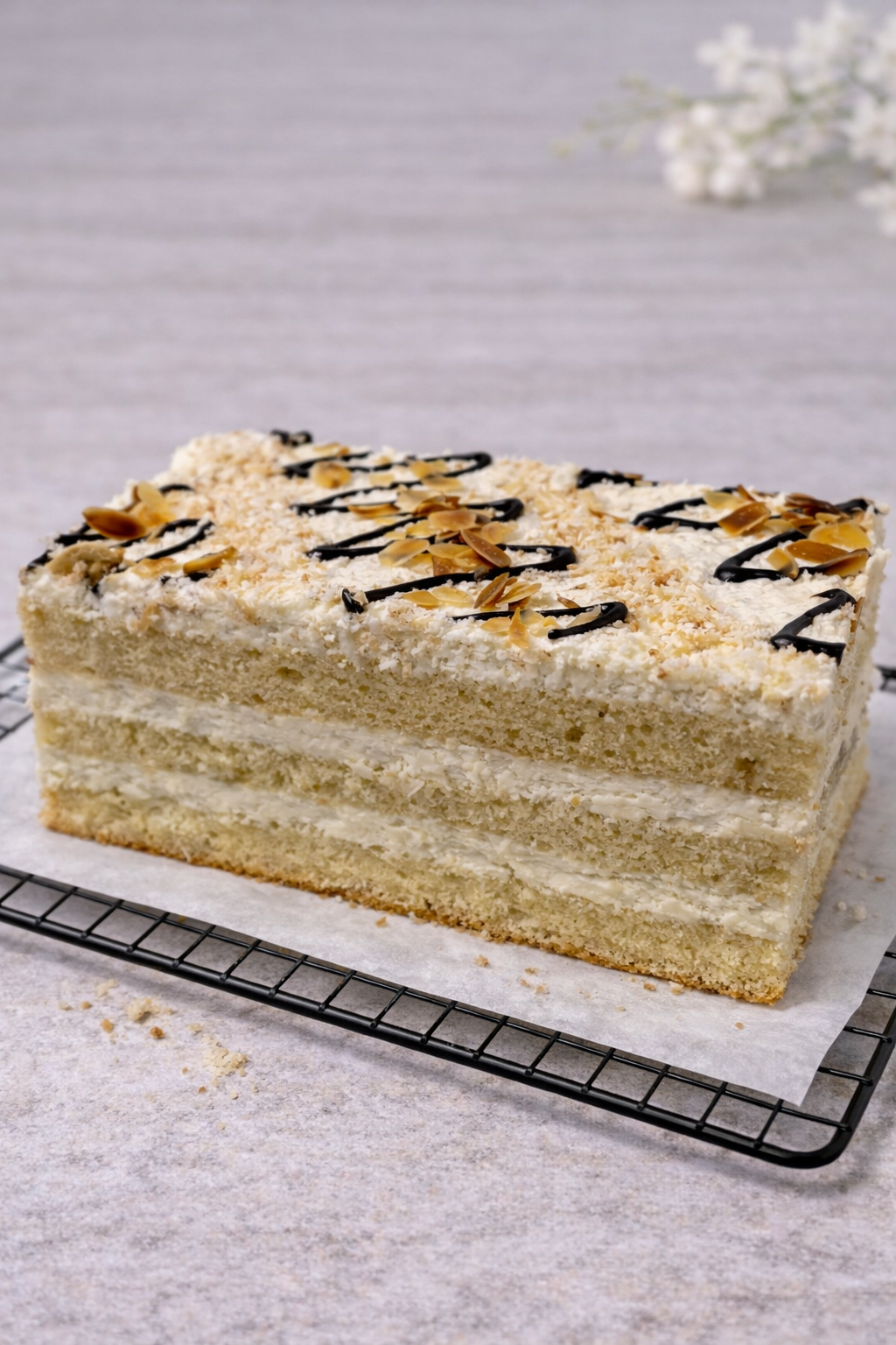 Ciasto z warstwami lekkiego biszkoptu i kremowym nadzieniem kokosowym. Wykończony kokosową polewą, płatkami migdałów i delikatną polewą czekoladową. Lekkie ciasto o smaku kokosa.