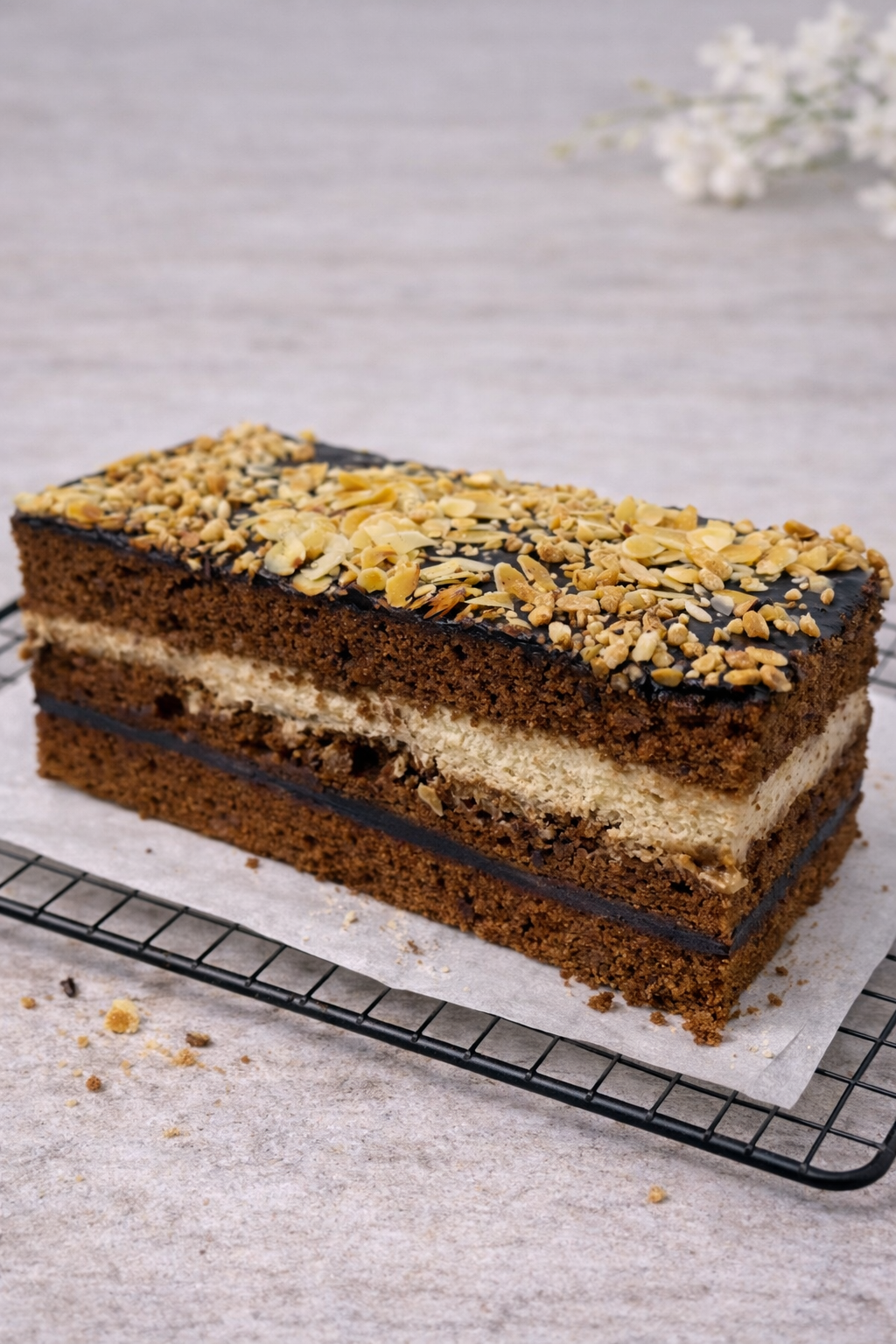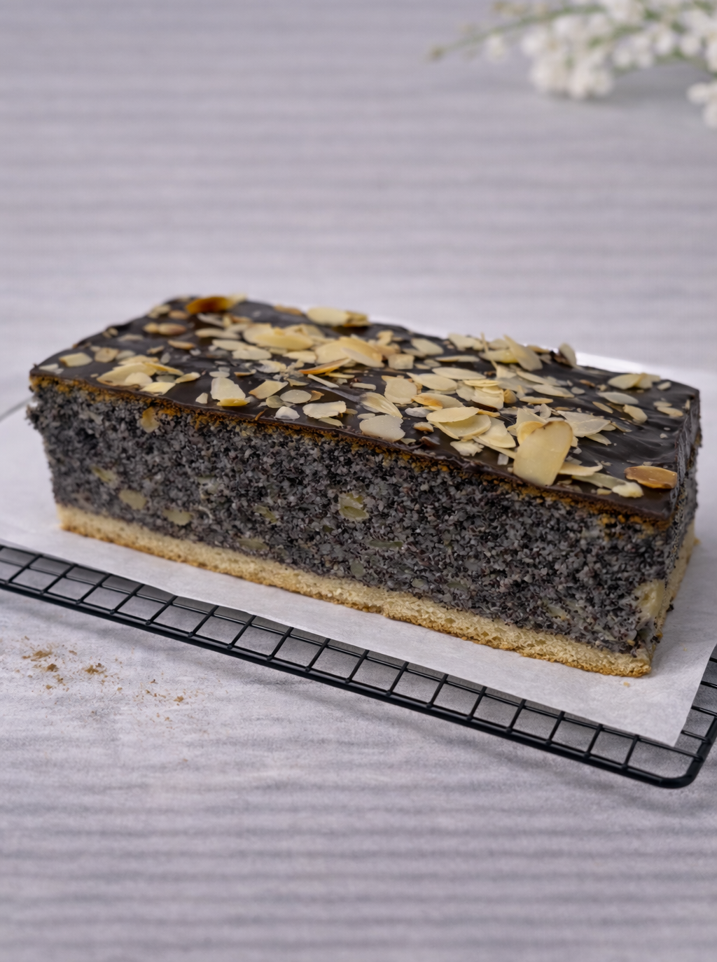 Tradycyjna makówka na kruchym spodzie, z wilgotną, aromatyczną masą makową. Wierzch pokryty delikatną polewą i posypany płatkami migdałów, które dodają przyjemnej chrupkości.