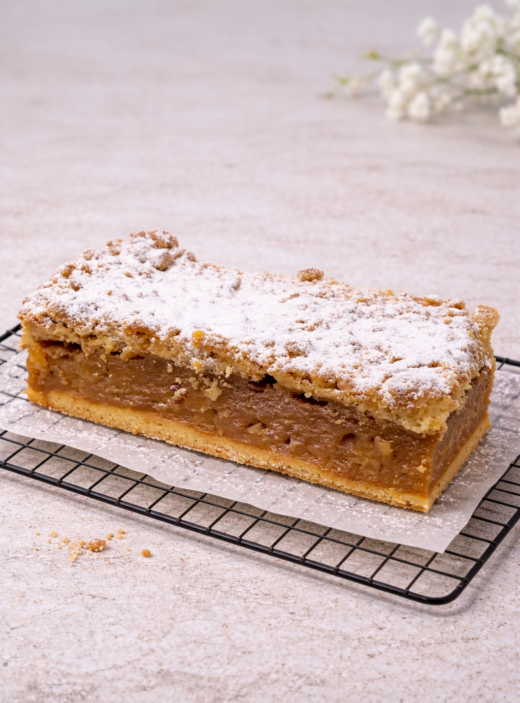 Szarlotka z warstwą kremowego budyniu i soczystymi jabłkami, na delikatnym cieście. Harmonijne połączenie słodyczy i owocowej świeżości, idealne do kawy lub herbaty.