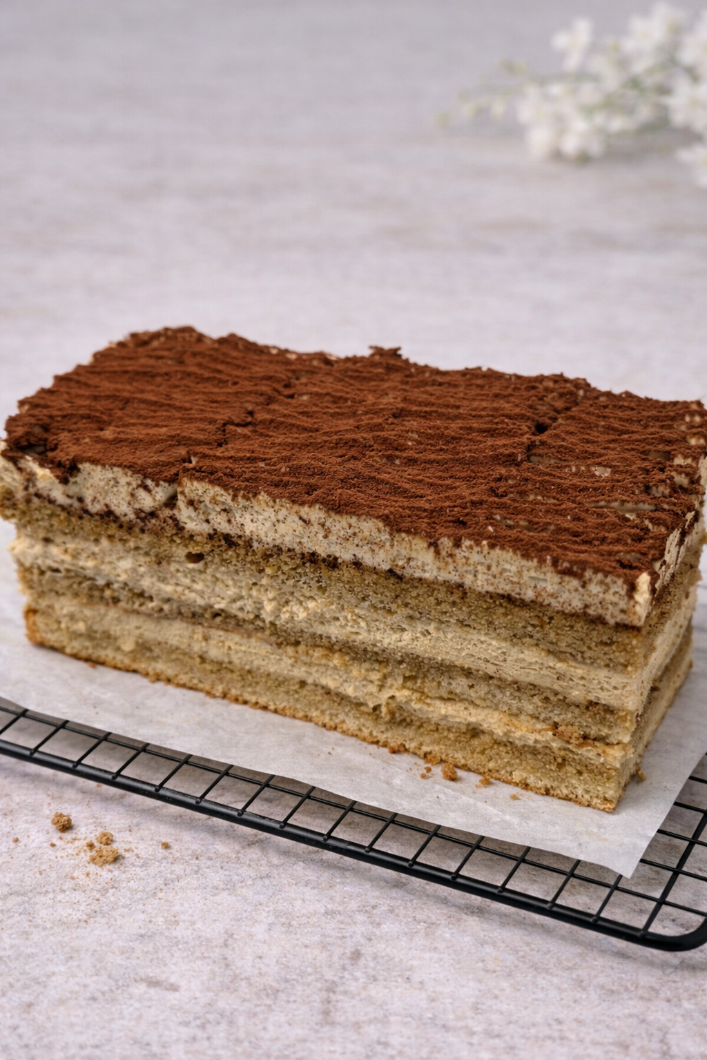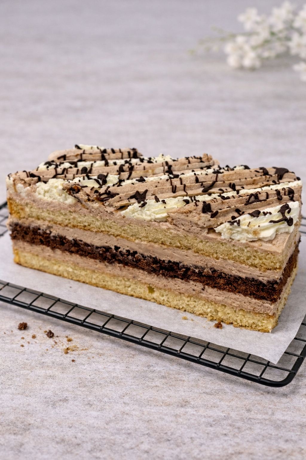 Kawowy deser na bazie biszkoptu nasączonego aromatyczną kawą, przełożonego pastą kawową i puszystym kremem o wyraźnym smaku kawy. Delikatne, kremowe i doskonale zbalansowane.