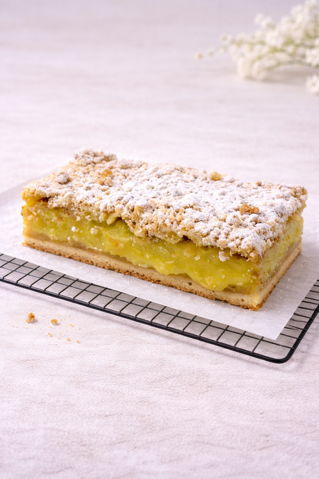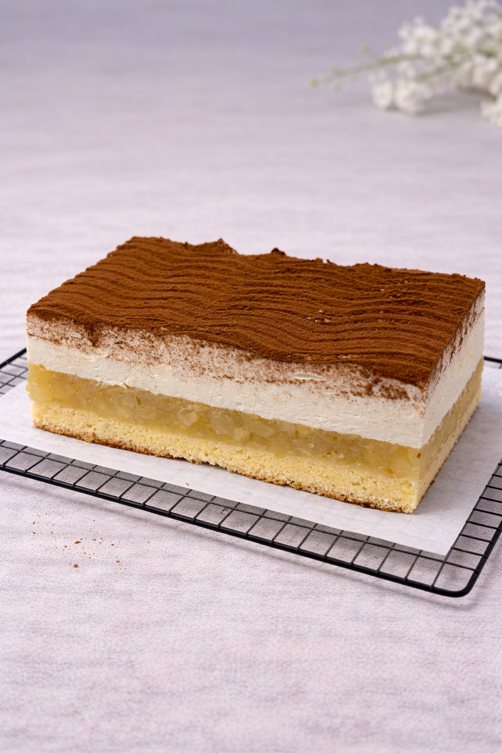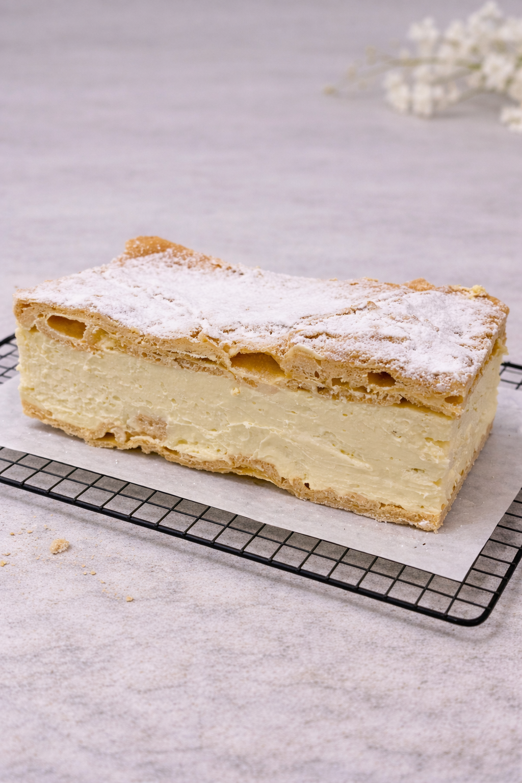 Klasyczna karpatka z lekkim, parzonym ciastem i aksamitnym kremem budyniowym. Delikatna, kremowa i przyjemnie rozpływająca się w ustach – ponadczasowy deser w domowym stylu.