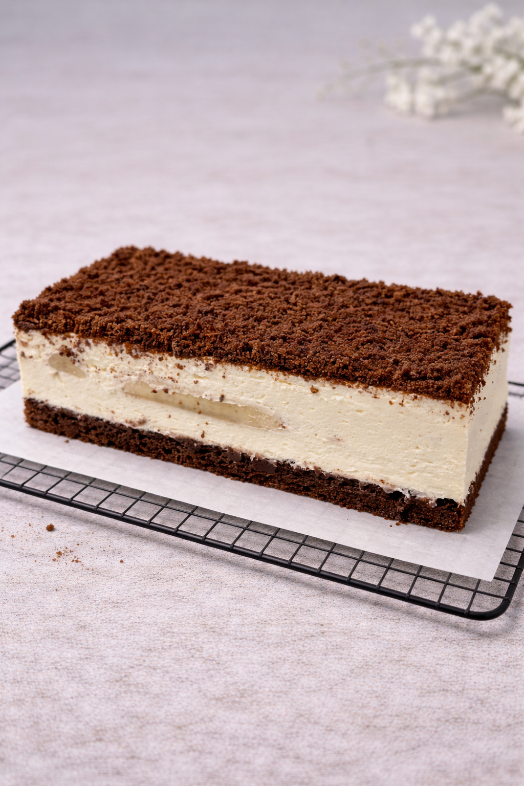 Sernik z kremowej masy serowej na kakaowym spodzie, wykończony warstwą kakaowej kruszonki. Klasyczne połączenie masy serowej i kruchego ciasta.
