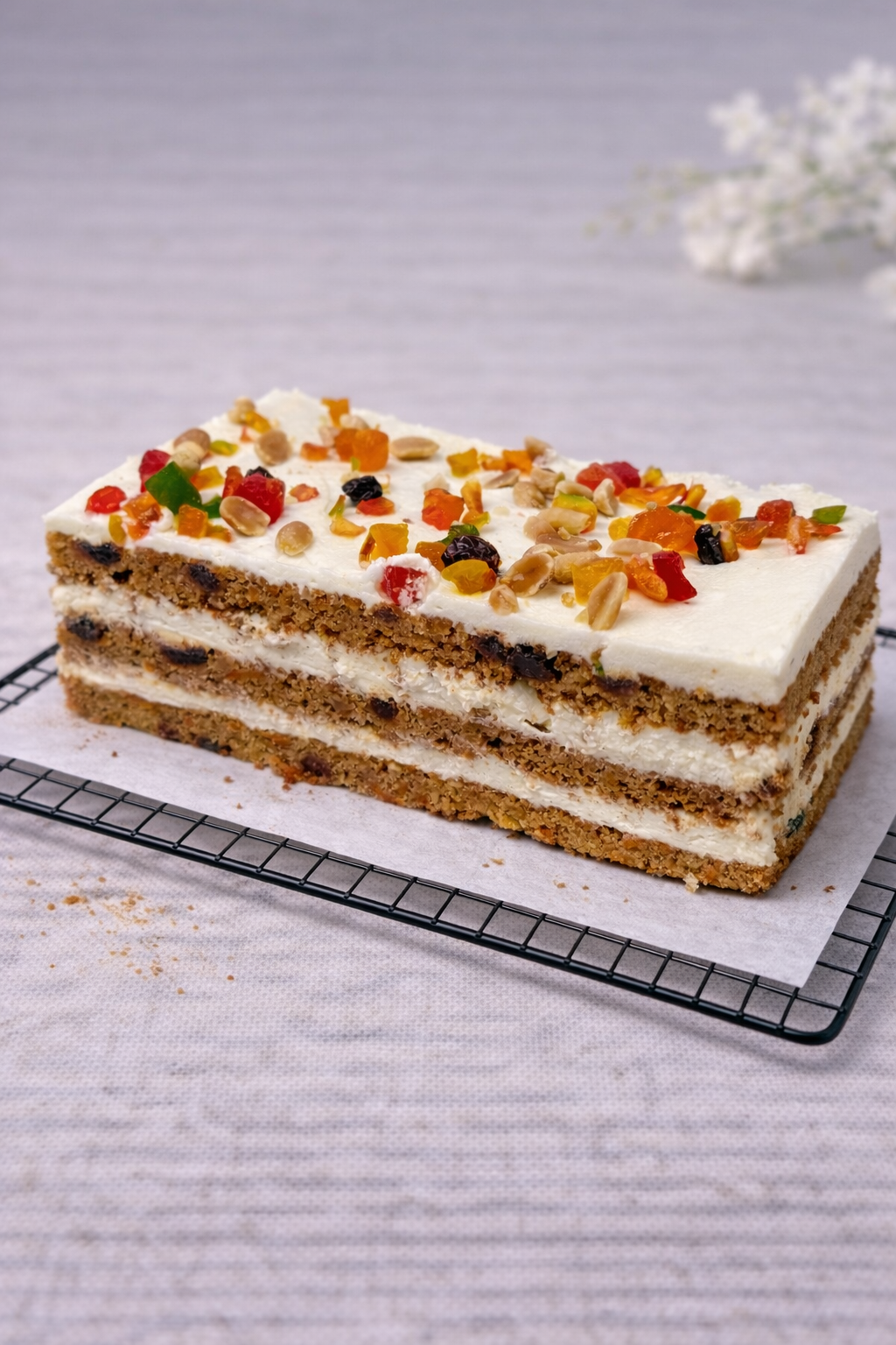 Aromatyczne ciasto marchewkowe z wilgotnym biszkoptem, przełożone delikatnym kremem. Wierzch wykończony gładką warstwą kremu i posypany mieszanką keksową, która dodaje koloru i lekkiej słodyczy.