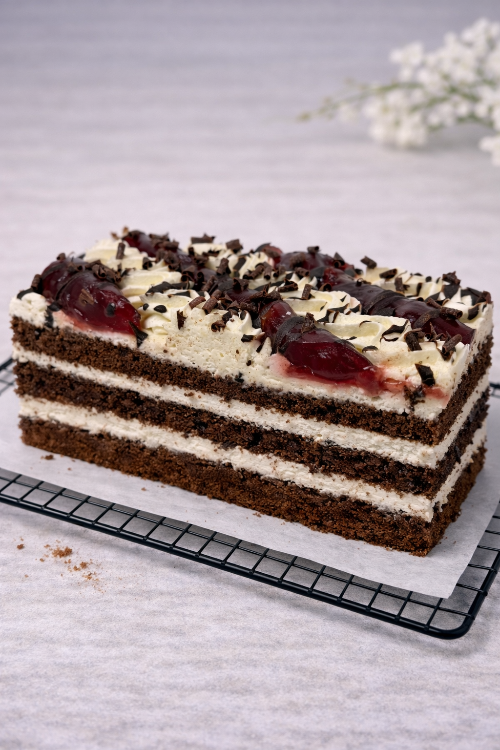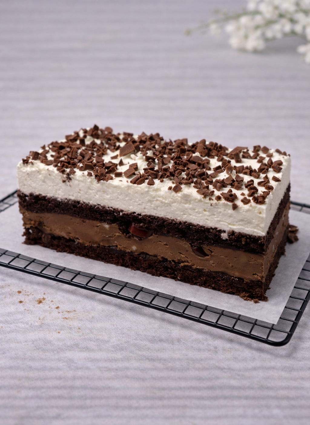 Ciasto z biszkoptowymi blatami o kakaowym smaku znajduje się aksamitny krem z dodatkiem soczystych wiśni. Całość tworzy harmonijne połączenie czekolady i owocowej świeżości.