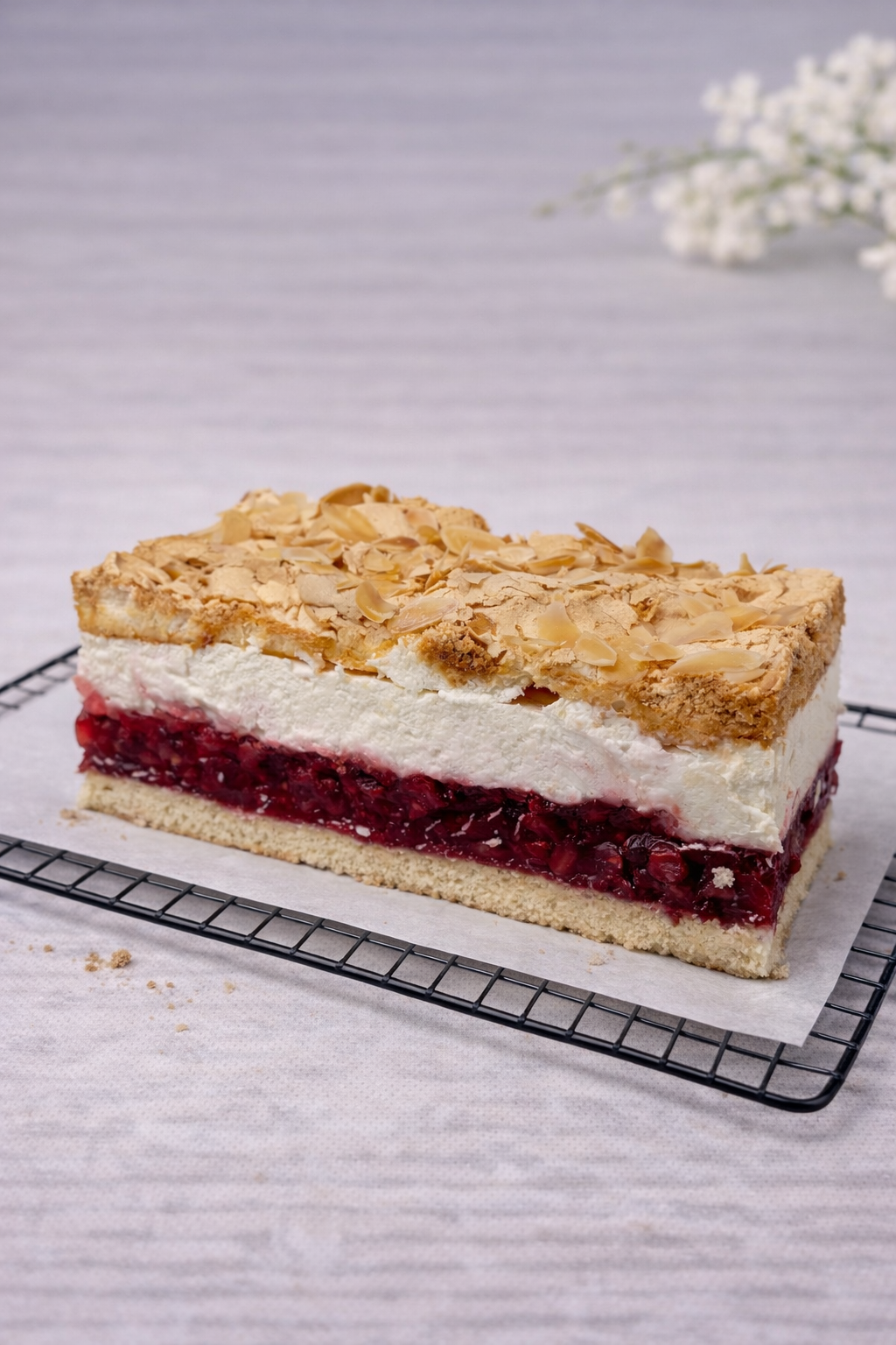 Kremowe ciasto z warstwą malinowej galaretki pełnej owoców, delikatnym kremem śmietankowym oraz lekką, chrupiącą bezą posypaną płatkami migdałów. Harmonijne w smaku, świeże i subtelnie słodkie.