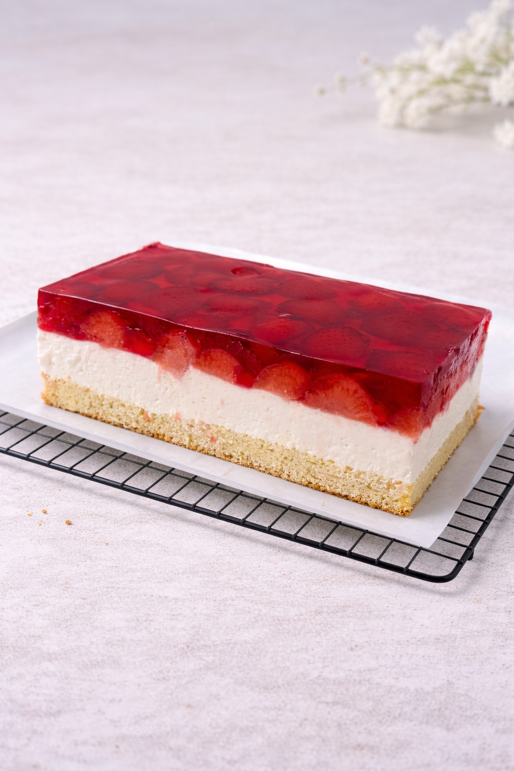Delikatne ciasto na puszystym biszkopcie, z lekką masą śmietankową i warstwą soczystych truskawek zatopionych w galaretce. Świeże, kremowe i idealnie zbalansowane w smaku.