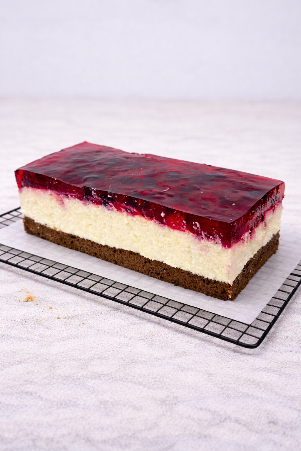 Lekki i kremowy sernik na zimno na czekoladowym spodzie, z dodatkiem owoców w masie serowej. Wierzch pokrywa lśniąca, owocowa galaretka, która nadaje mu świeżości i eleganckiego wyglądu.