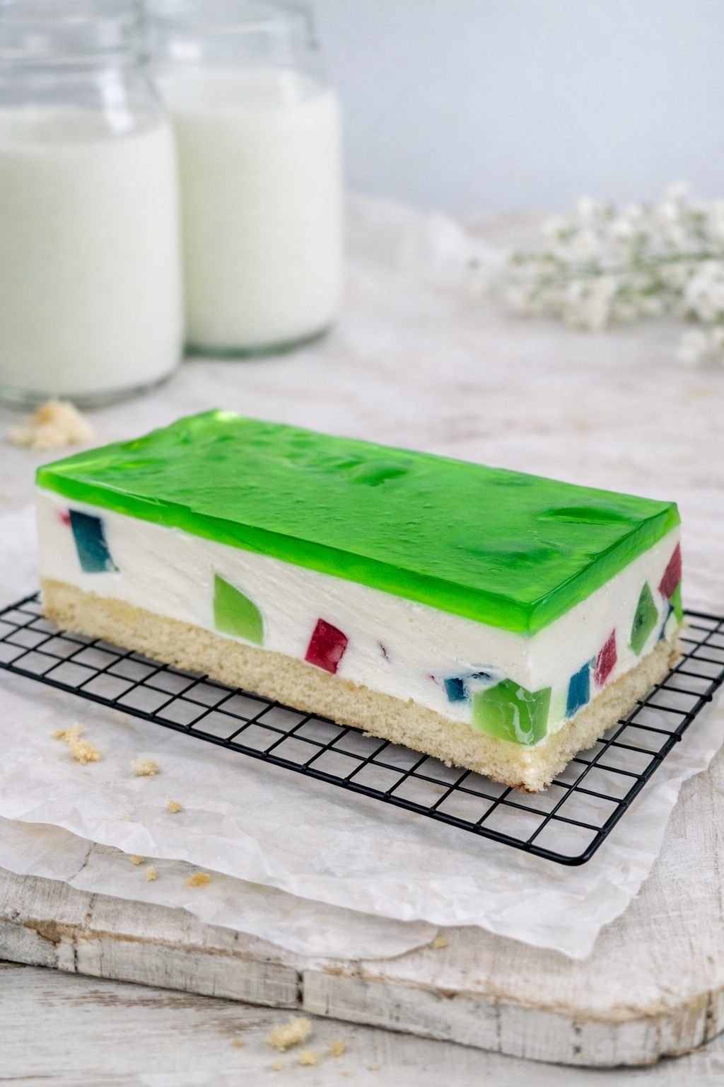 Lekki i delikatny deser na jasnym biszkoptowym spodzie z puszystą, śmietankową masą przełożoną kolorowymi kawałkami galaretki. Wierzch pokrywa lśniąca, zielona galaretka.